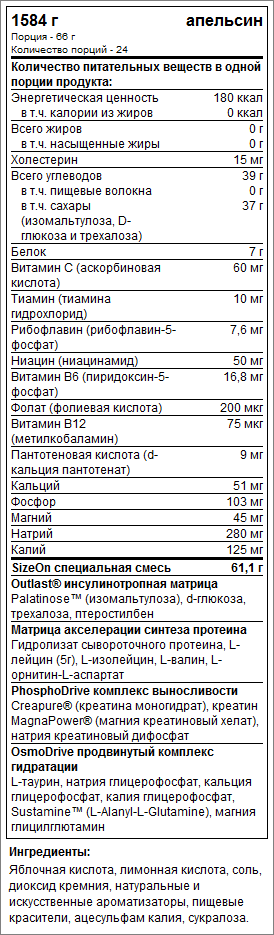 Лучший Восстановитель 2010 года!!! Гибридная формула сывороточного гидролизата и креатина с углеводной матрицей Outlast® Gaspari поднимает спортивное питание на новый уровень благодаря SizeOn, уникальной креатиновой формуле для приема во время тренировки. Также как совершенствуются клинические исследования, также и Gaspari Nutrition улучшает свои продукты. Поэтому SizeOn теперь эволюционировал в совершенную гибридную тренировочную формулу с сывороточным гидролизатом и креатином. Теперь в SizeOn используется высококачественный гидролизат сыворотки, который содержит более 50% ди- и трипептидов, а также широкий спектр анаболических ингредиентов, таких как L-лейцин в высокой дозировке (5 г). Все это позволяет невероятно увеличить спортивную работоспособность, скорость восстановления скелетных мышц, взрывную силу и, самое главное, мышечную массу уже во время вашей тренировки! Помимо этого, исследователи Gaspari Nutrition использовали всю мощь птеростилбена, новейшего стимулятора секреции инсулина, предназначенного специально для работы совместно со всемирно известной углеводной смесью Outlast™. Эта мощная комбинация запускает и поддерживает мышечную волюмизацию и анаболизм на уровне, до сих пор недоступном для других продуктов спортивного питания. Мы также включили в состав LOLA™, нашу новейшую аминокислотную соль L-орнитина и L-аспартата, детоксифицирующую аммиак и противостоящую усталости. Подводя итог, можно сказать, что компания Gaspari Nutrition вновь превзошла себя и заново установила стандарты качества и эффективности уже известных многие годы продуктов! Что делает SizeOn Maximum Performance?